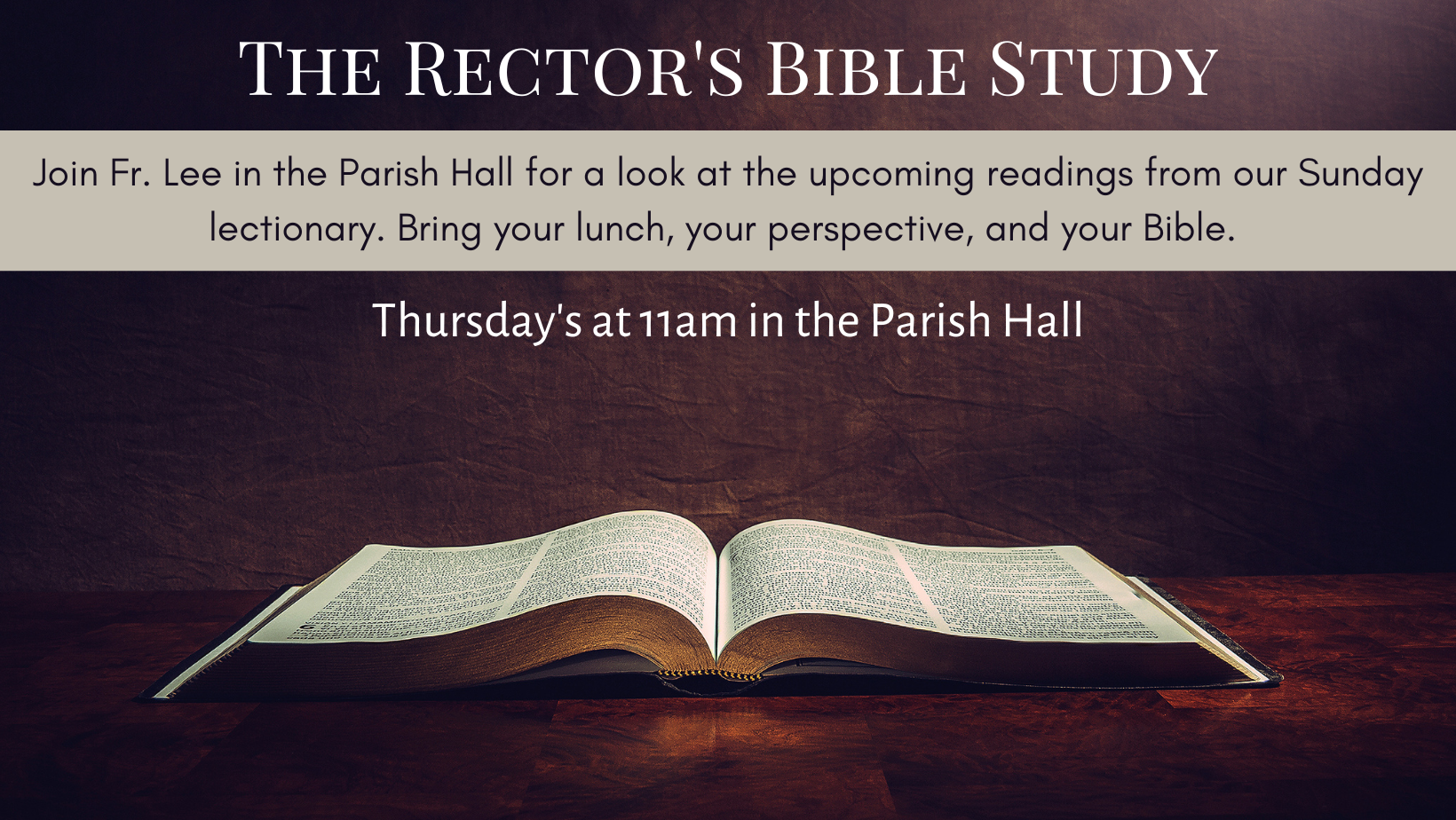 Join Fr. Lee in the Parish Hall as we read and study scripture to develop a deeper understanding of our faith and delight in the Word of God. Bring your perspective and your Bible.