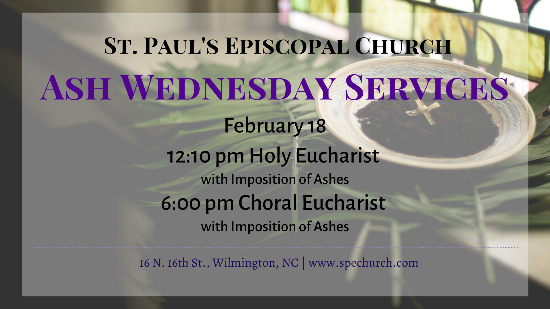 Ash Wednesday marks the beginning of the forty days of Lent, named for the custom of placing blessed ashes on the foreheads of worshipers at Ash Wednesday services. Join us at 12:10 pm for Holy Eucharist with Imposition of Ashes or at 6:00 pm for Choral Eucharist with Imposition of Ashes.
